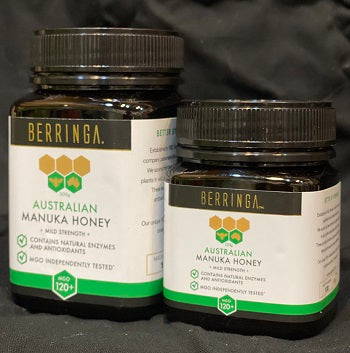 Berringa's 100% Australian Manuka Honey MGO120+ is a mild strength bioactive honey suitable for everyday use and wellness. It contains natural enzymes and antioxidants and is perfect as an additive for foods and drinks, can be taken by itself or applied topically.