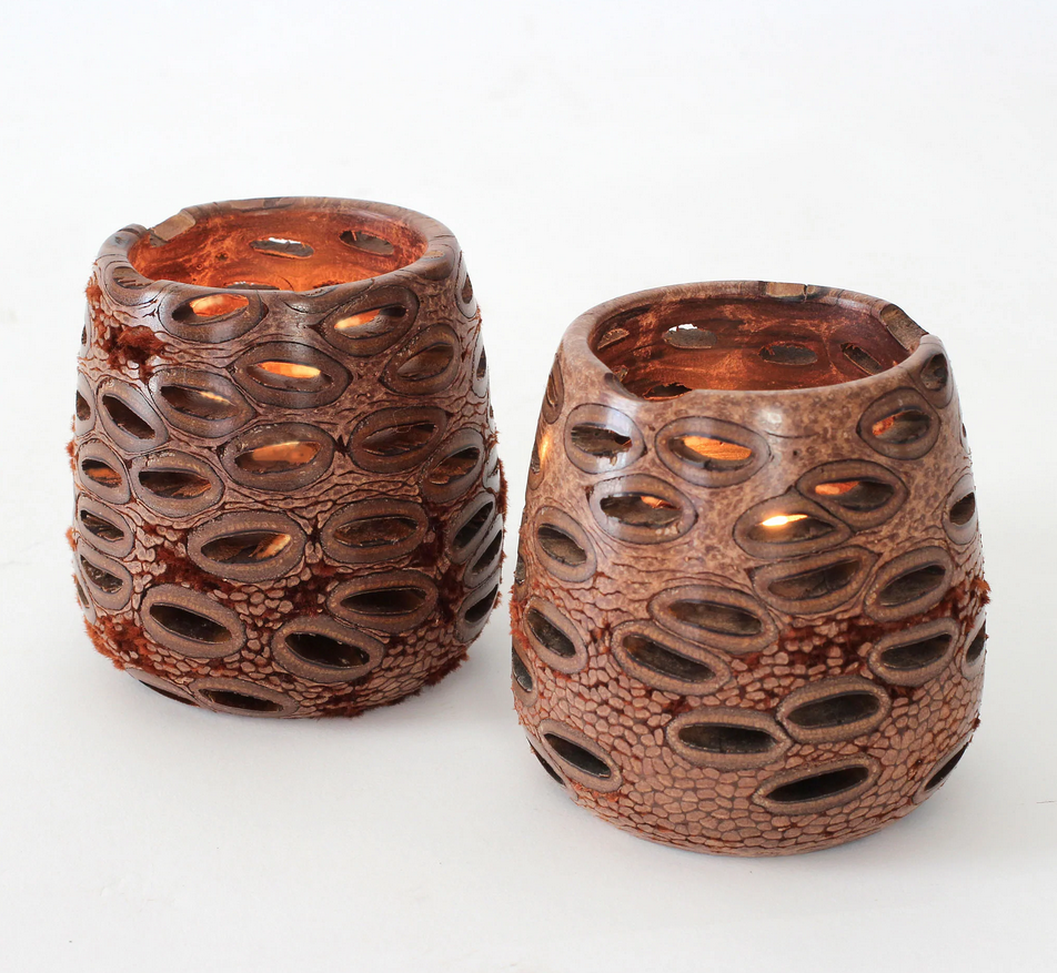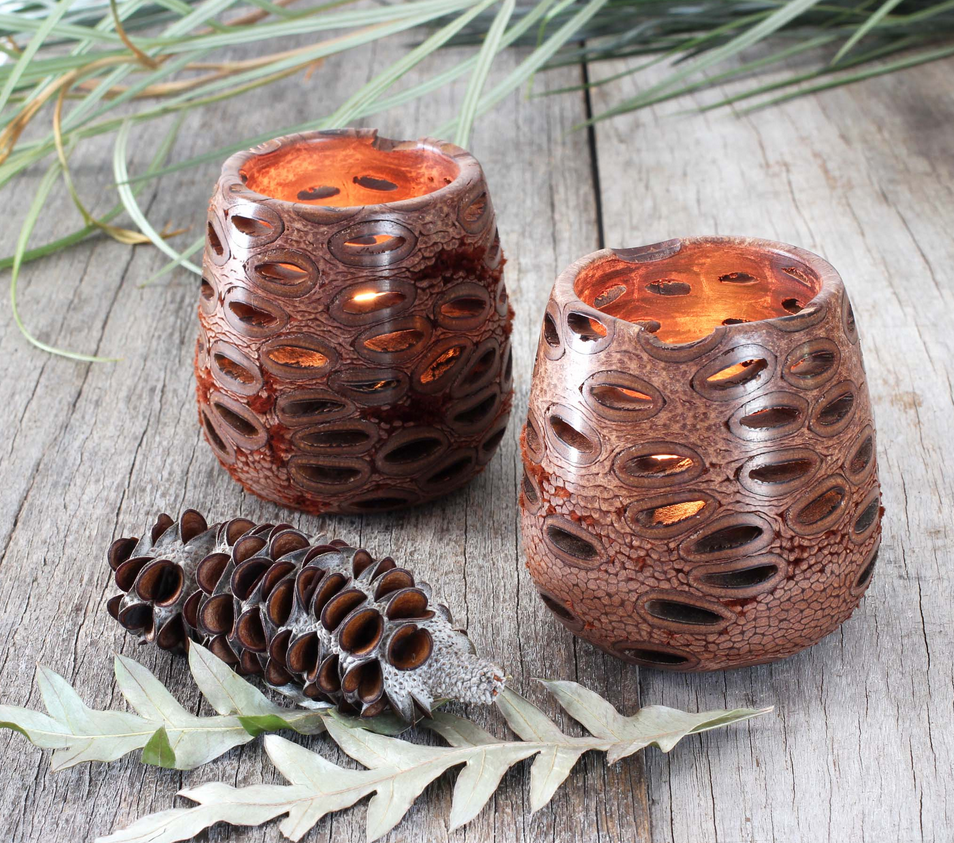 Boxed Pair of Banksia Nut Tea Light Candle Holders